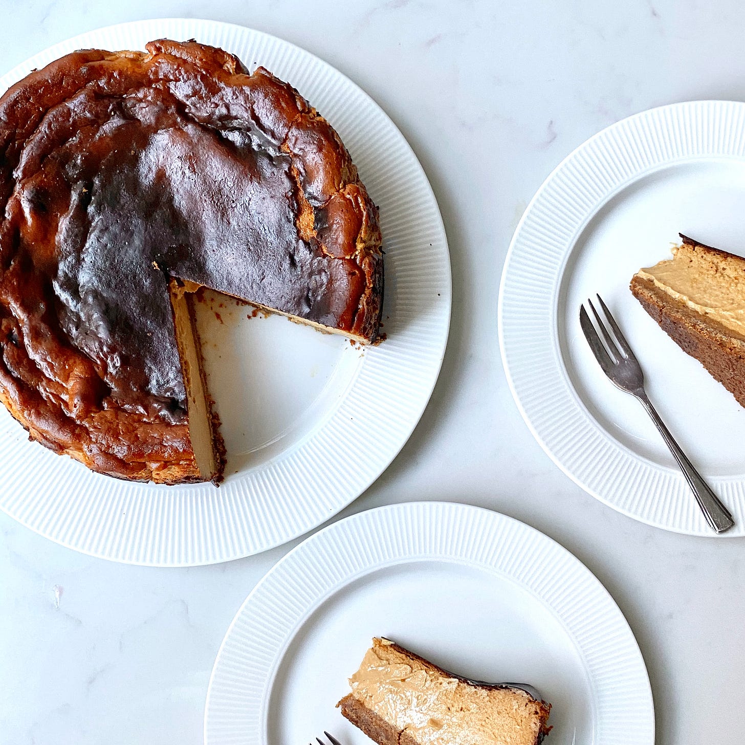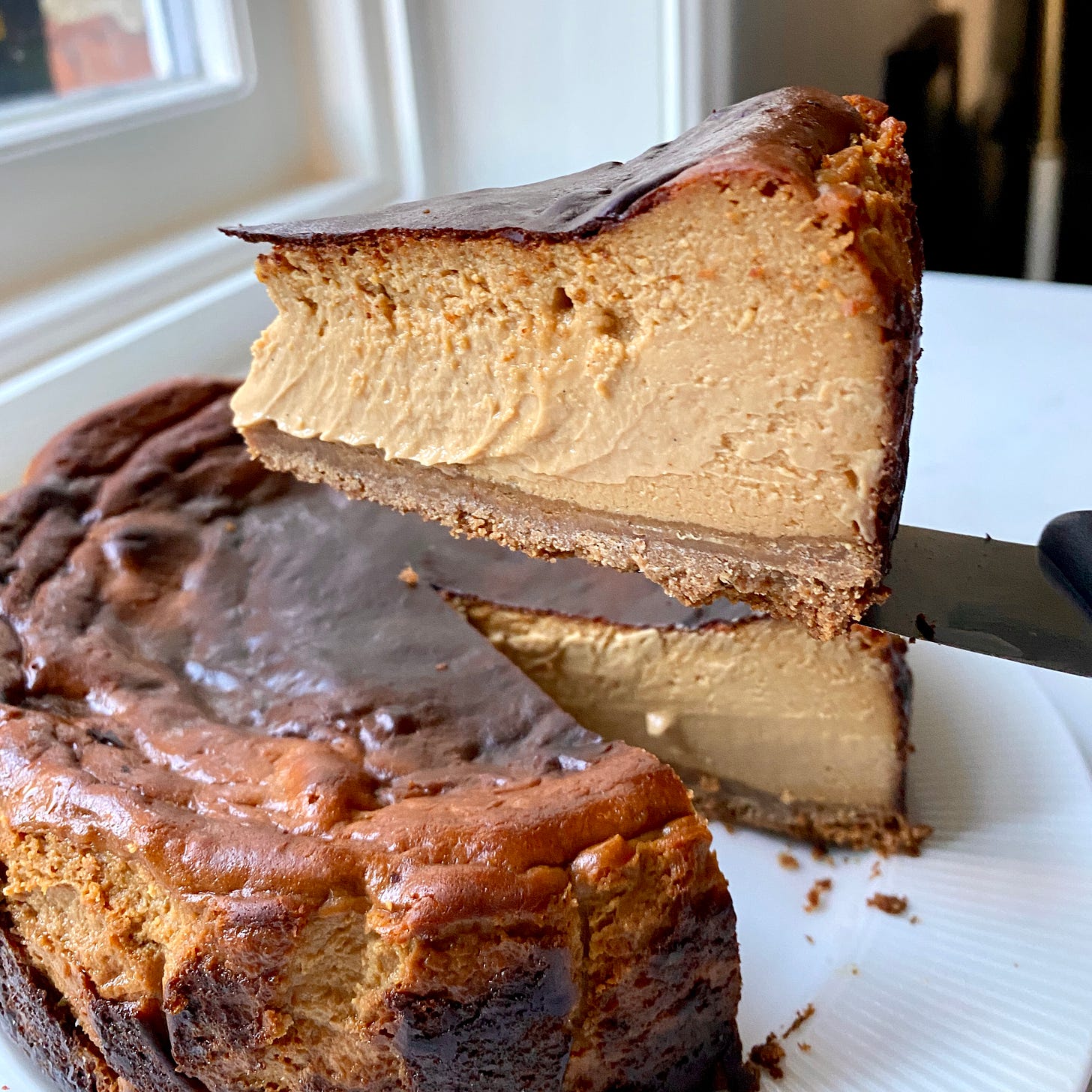 Basque cheesecake lends itself beautifully to caramelisation because it contains much more sugar than a regular cheesecake. This gives us the perfect opportunity to caramelise the sugar and add a depth of flavour. I love eating this cheesecake on its own, unadulterated, but it also pairs wonderfully with caramelised apples or alcohol-soaked dried fruit. I especially love Pedro Ximénez soaked prunes.