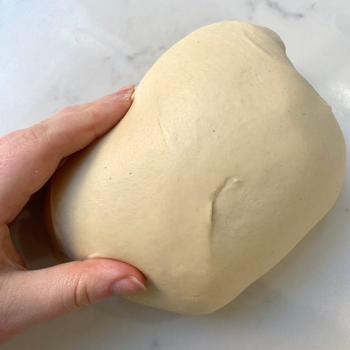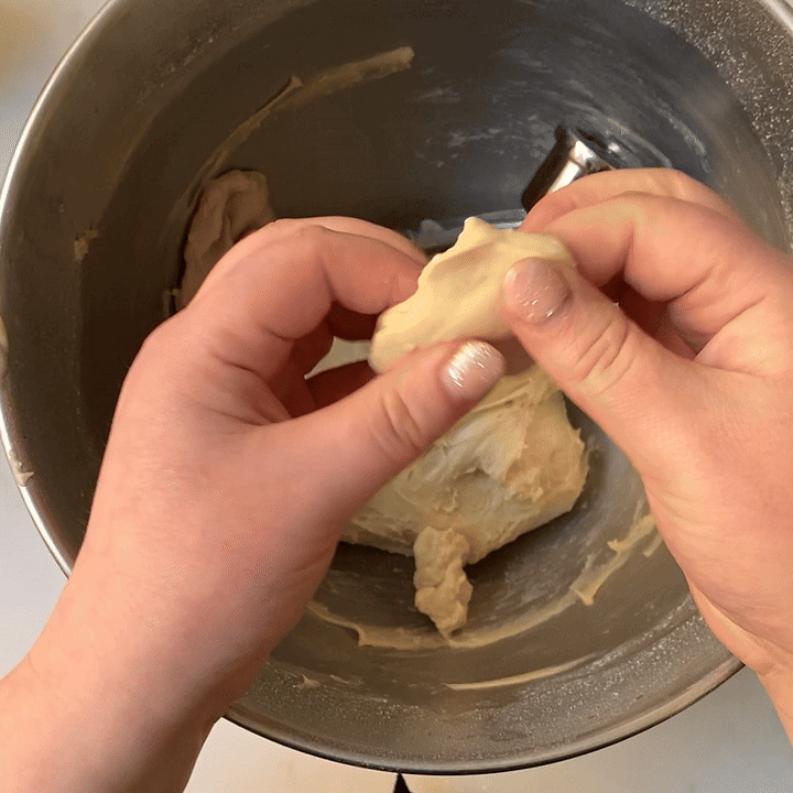 Mix with the dough hook attachment on low until everything is combined, then turn the speed up to medium/high and mix for 7–12 minutes, until the dough starts to get nice and stretchy. It should be smooth, elastic, and able to pass the windowpane test.