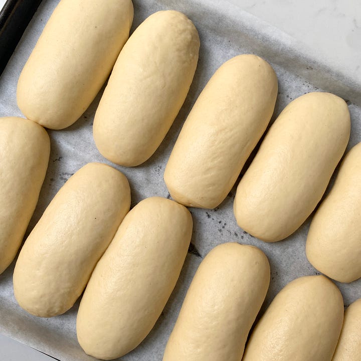 . The glutinous rice flour helps with moisture retention, meaning the bread stays soft for longer once baked. Don’t worry if you don’t have any, strong/bread flour also works. The only downside to this dough is that, unless you’re really confident shaping something sticky, it needs an overnight chill. This gives the fats time to firm up a bit, making shaping much easier.Batch Size – I almost always portion my dough into 60g pieces if I’m making individual buns, so I wanted to make sure the batch size was sensible. This recipe divides perfectly into 12 buns, which feels just right. A baker’s dozen of 13 might have been more fitting, but you can’t win ‘em all.