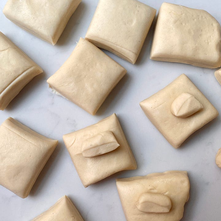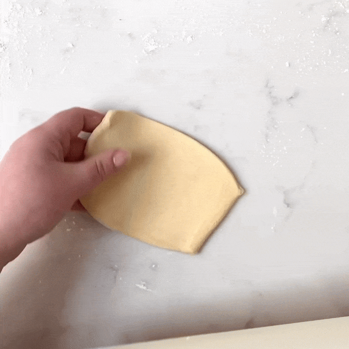 Dust your surface with flour and then roll out each portion of dough into a roughly 10 x 10cm square, don’t worry if it’s not super neat, but do pay attention to the size, they can easily get a bit too long!