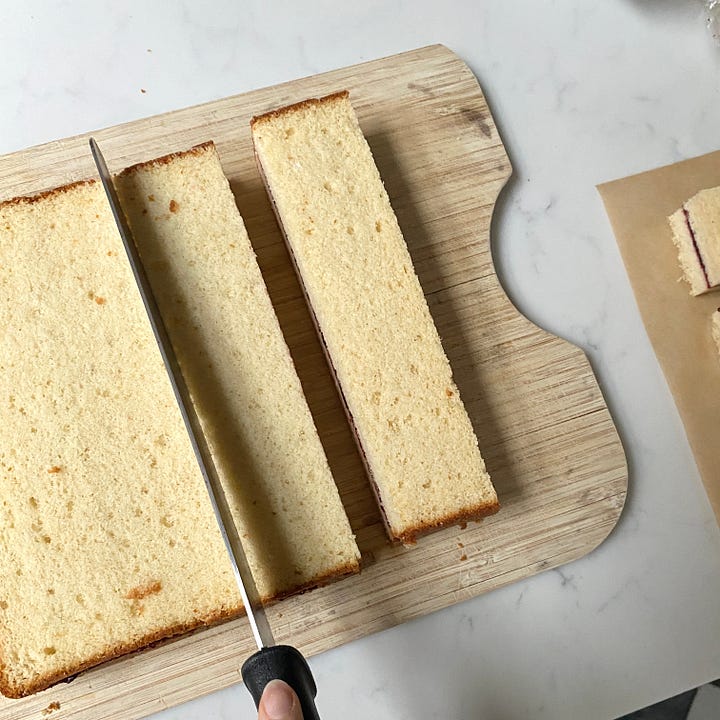 As I’ve already covered sponges extensively in my vanilla sponge deep dive, we’ll skip that part and get straight into the cutting and dipping.